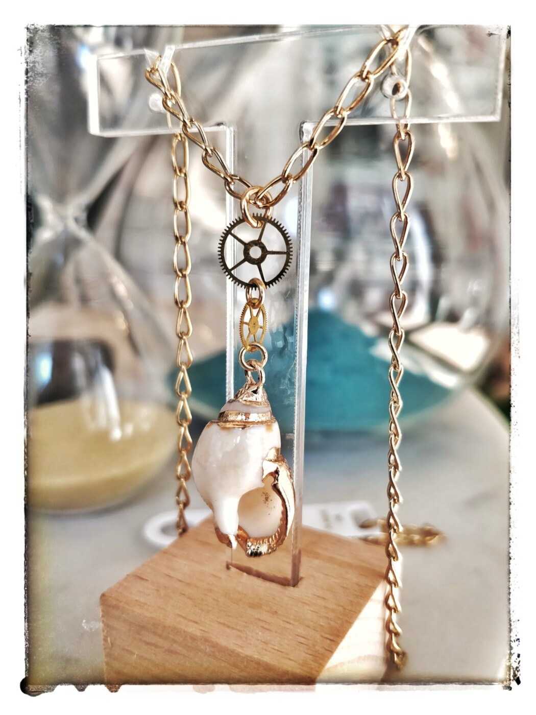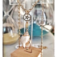 Tous nos colliers sont composés de chaînes en plaqué or fabriquées en France, de motifs en laiton doré à l’or fin 24K,  et de rouages (véritables). Ils sont garantis sans nickel et plomb.