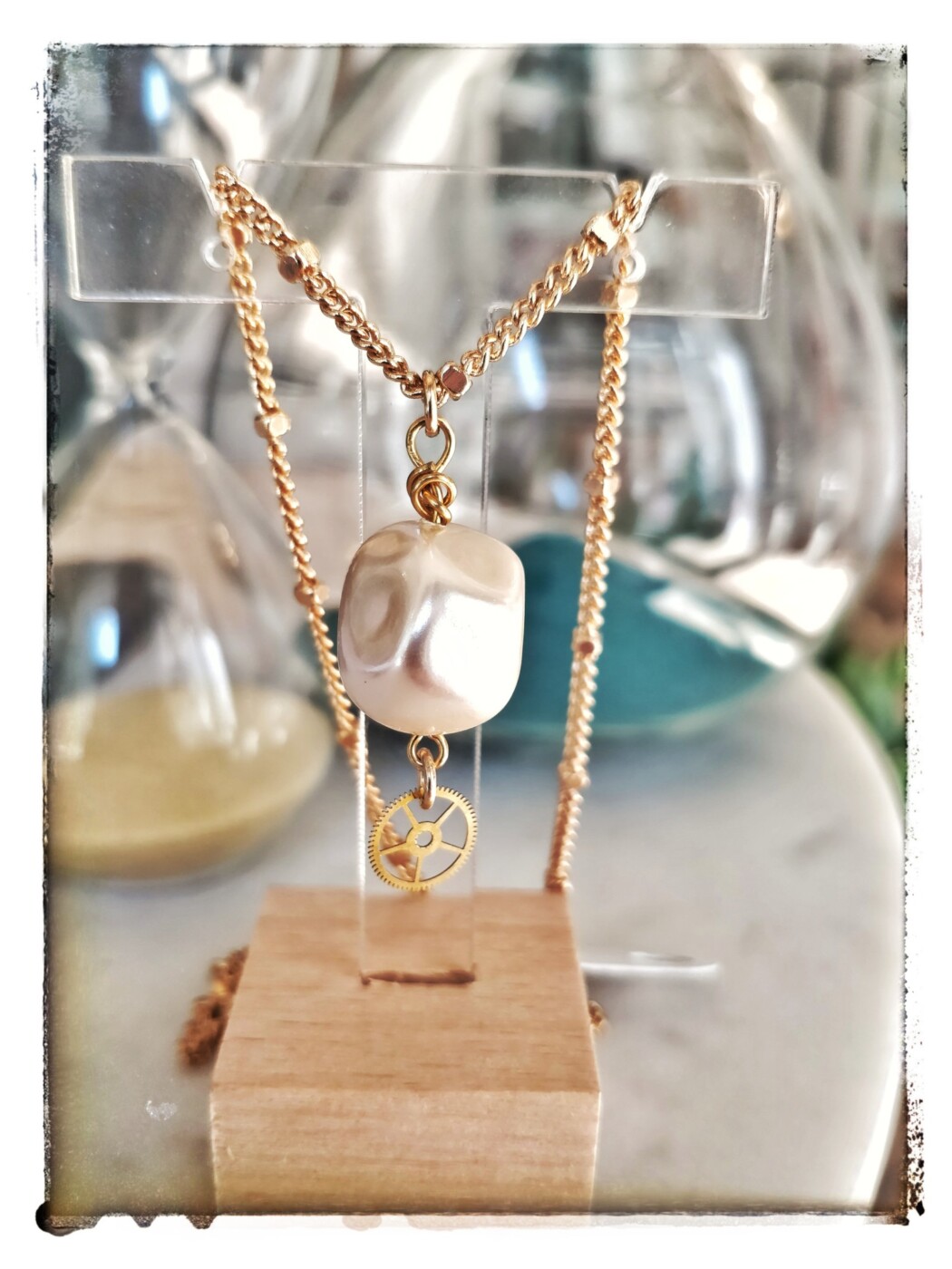 Tous nos colliers sont composés de chaînes en plaqué or fabriquées en France, de motifs en laiton doré à l’or fin 24K,  et de rouages (véritables). Ils sont garantis sans nickel et plomb.