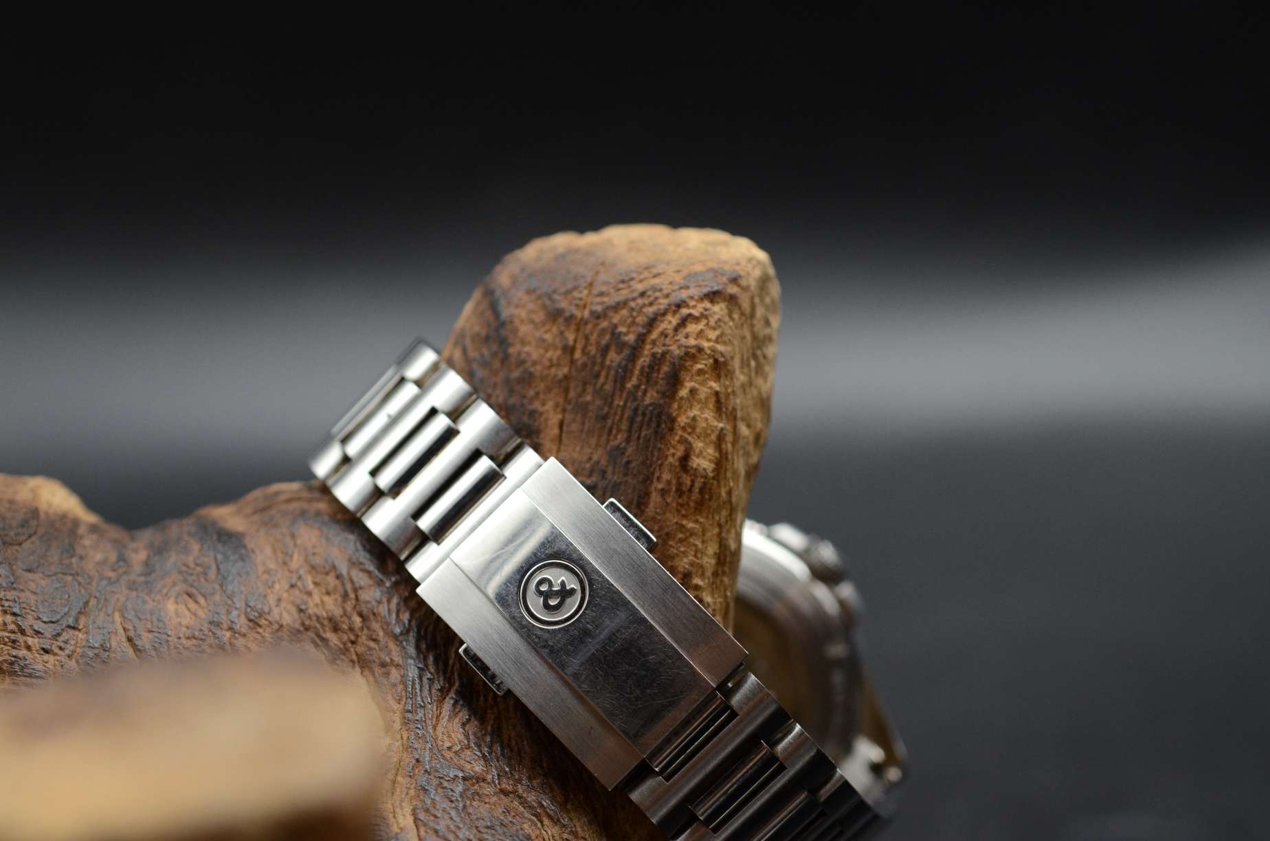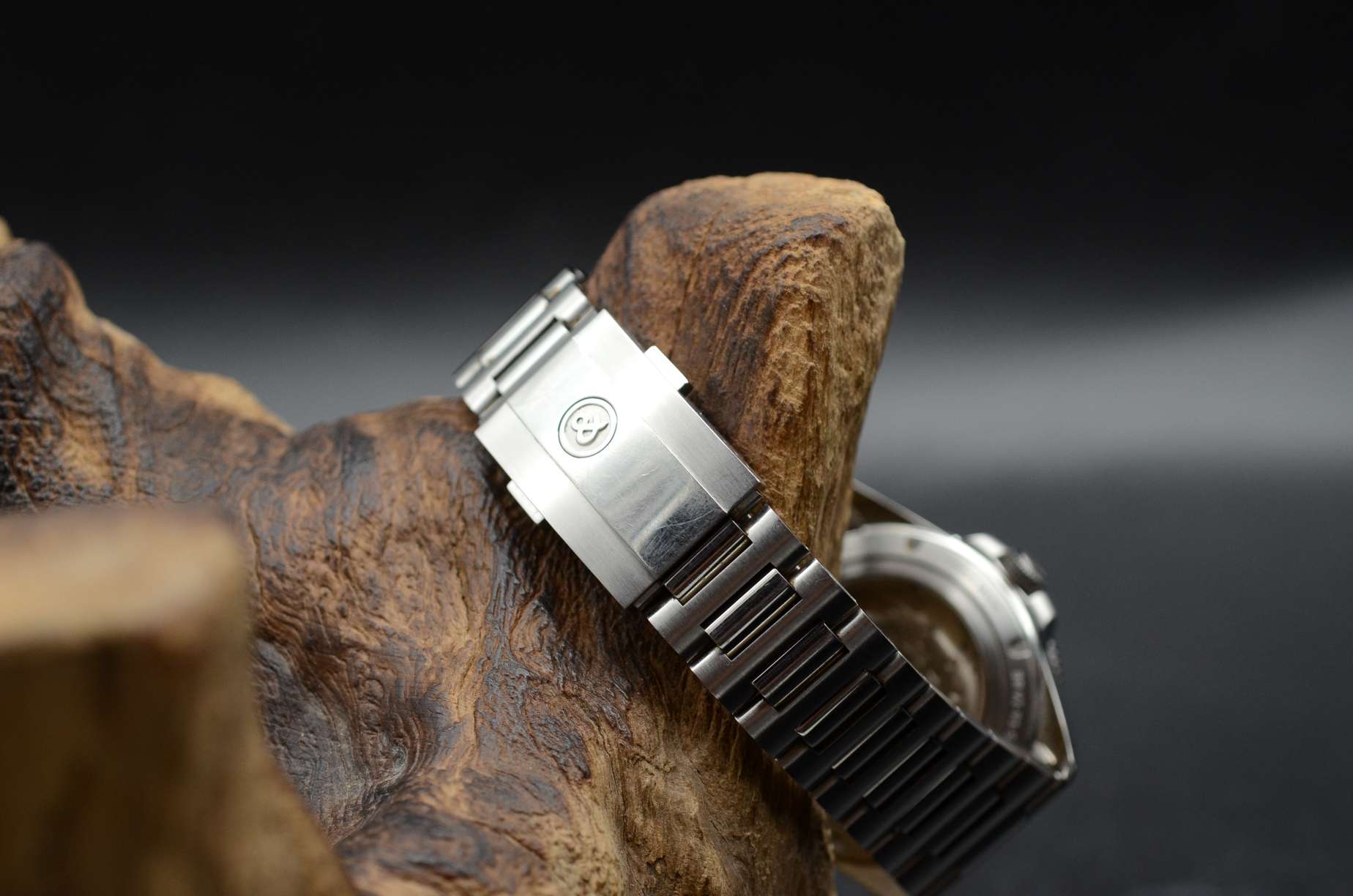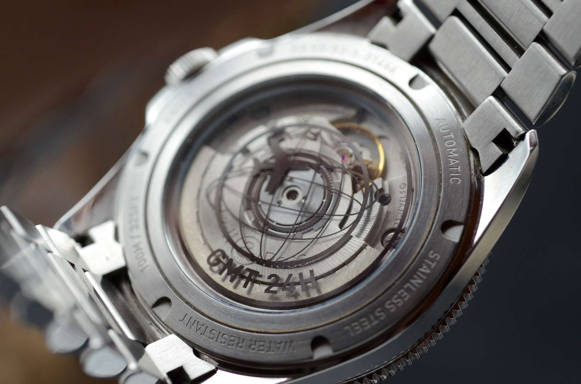 Le cadran noir mat est conçu pour une lisibilité maximale. Les index appliqués et aiguilles sont recouverts de Super-LumiNova, assurant une lecture parfaite de l’heure de jour comme de nuit. L’aiguille GMT à pointe colorée permet d’identifier instantanément le second fuseau horaire, tandis que le guichet date discret complète l’ensemble avec élégance.