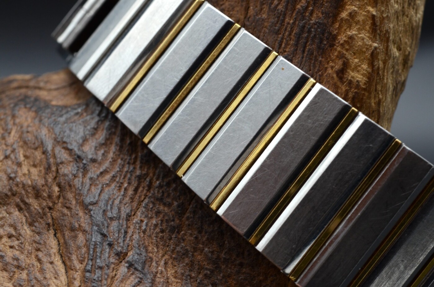 - Bracelet : Acier inoxydable avec inserts dorés, parfaitement intégré au boîtier pour un confort optimal.