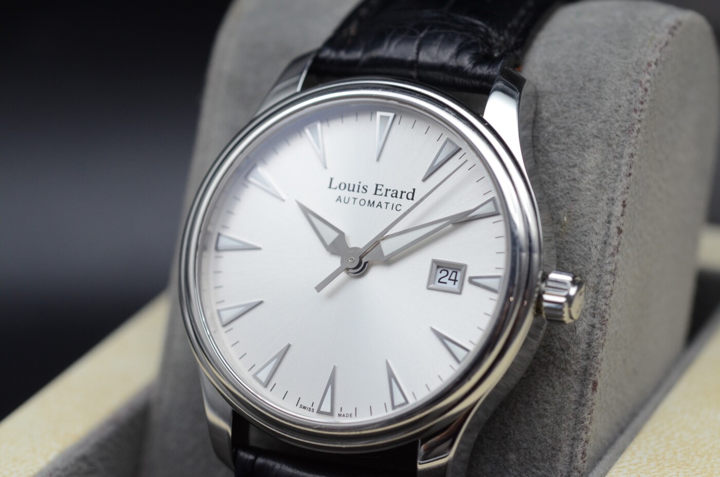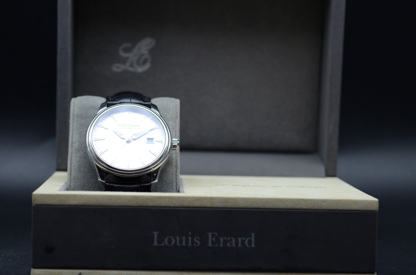 Cette montre Louis Erard Heritage est livrée dans sa boîte d’origine, avec manuel d’instruction et carte de garantie, et se trouve en bon état. Avec une étanchéité de 5 ATM, elle est adaptée à un usage quotidien tout en restant un symbole de luxe discret et classique.