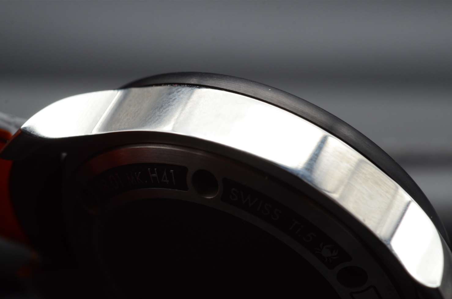 Le cadran de la H41, signature de la marque, présente un design épuré, sans chiffres ni index traditionnels, remplacés par des appliques lumineuses sur les contours du cadran. Ces éléments luminescents sont dotés de Super-LumiNova X1 , garantissant une lisibilité parfaite dans les conditions de faible luminosité ou sous l’eau. Ce choix de conception renforce le minimalisme de la montre tout en lui donnant un aspect futuriste et fonctionnel.