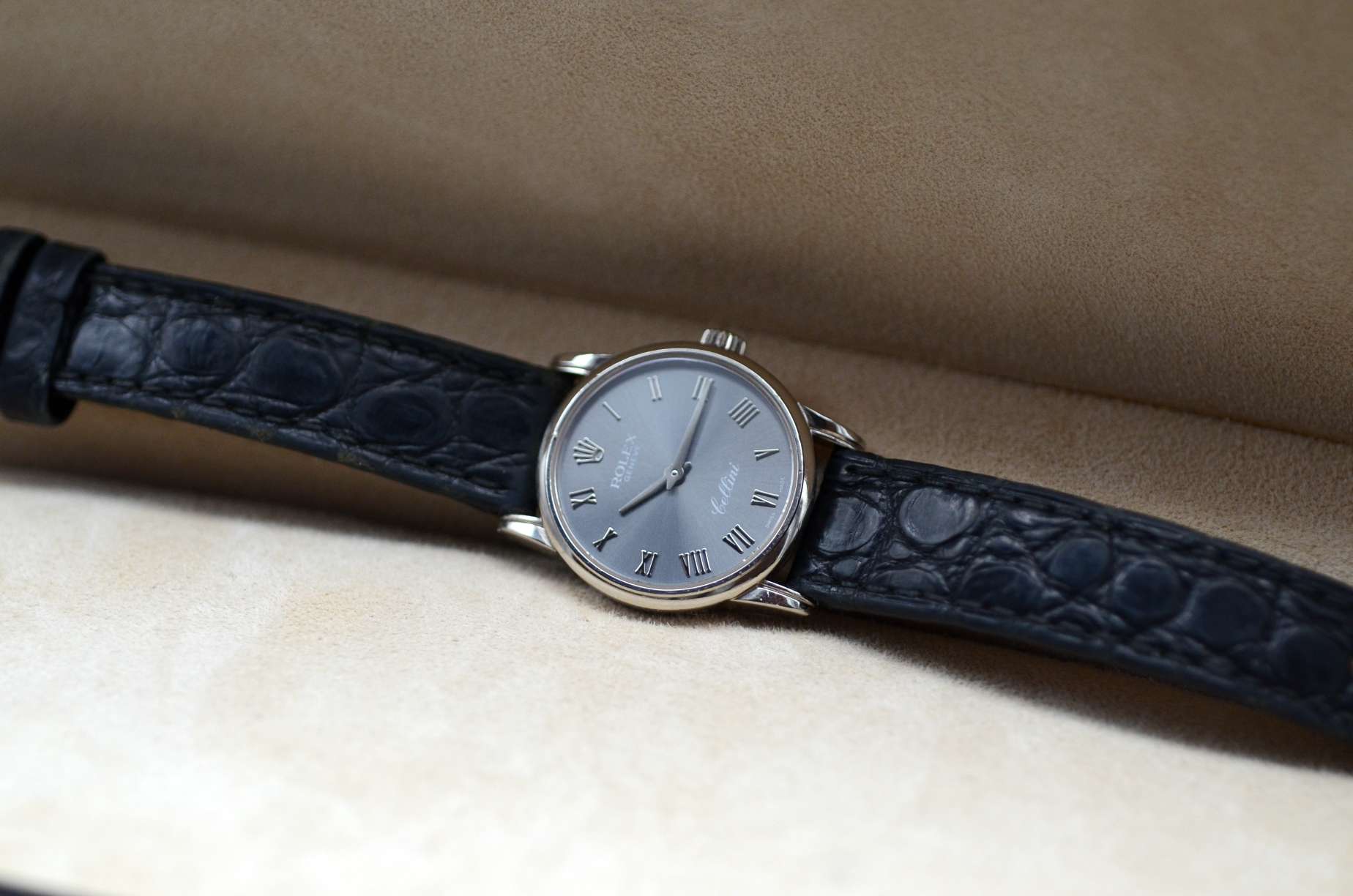 Le cadran gris foncé confère à cette Cellini une esthétique contemporaine et polyvalente : parfaite pour un usage quotidien chic ou pour compléter une tenue habillée lors d’occasions formelles. Le boîtier en or blanc 18 carats souligne le statut de montre de prestige tout en gardant une allure discrète.