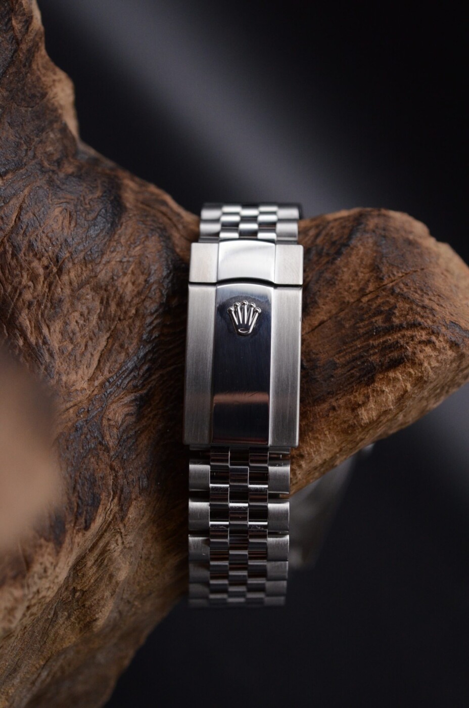 Le bracelet Oyster en acier inoxydable, avec ses maillons robustes et sa finition polie, complète l’esthétique classique de la montre. La boucle déployante Oysterlock assure un ajustement sécurisé et confortable, ajoutant une touche de praticité à cette pièce horlogère exceptionnelle.