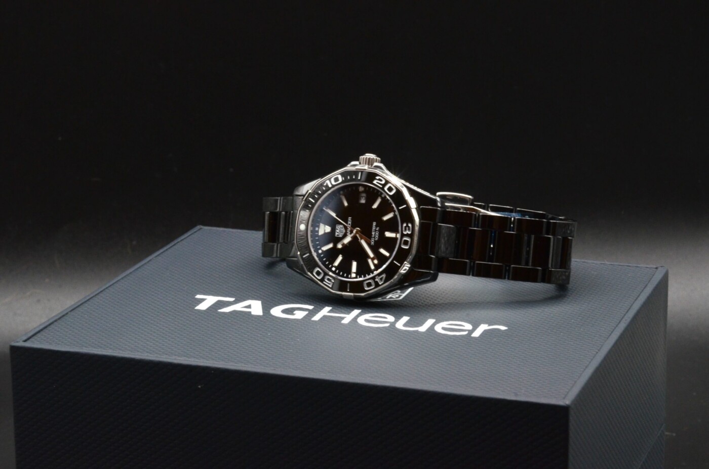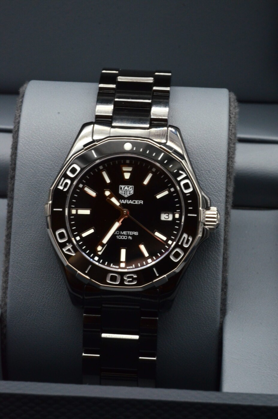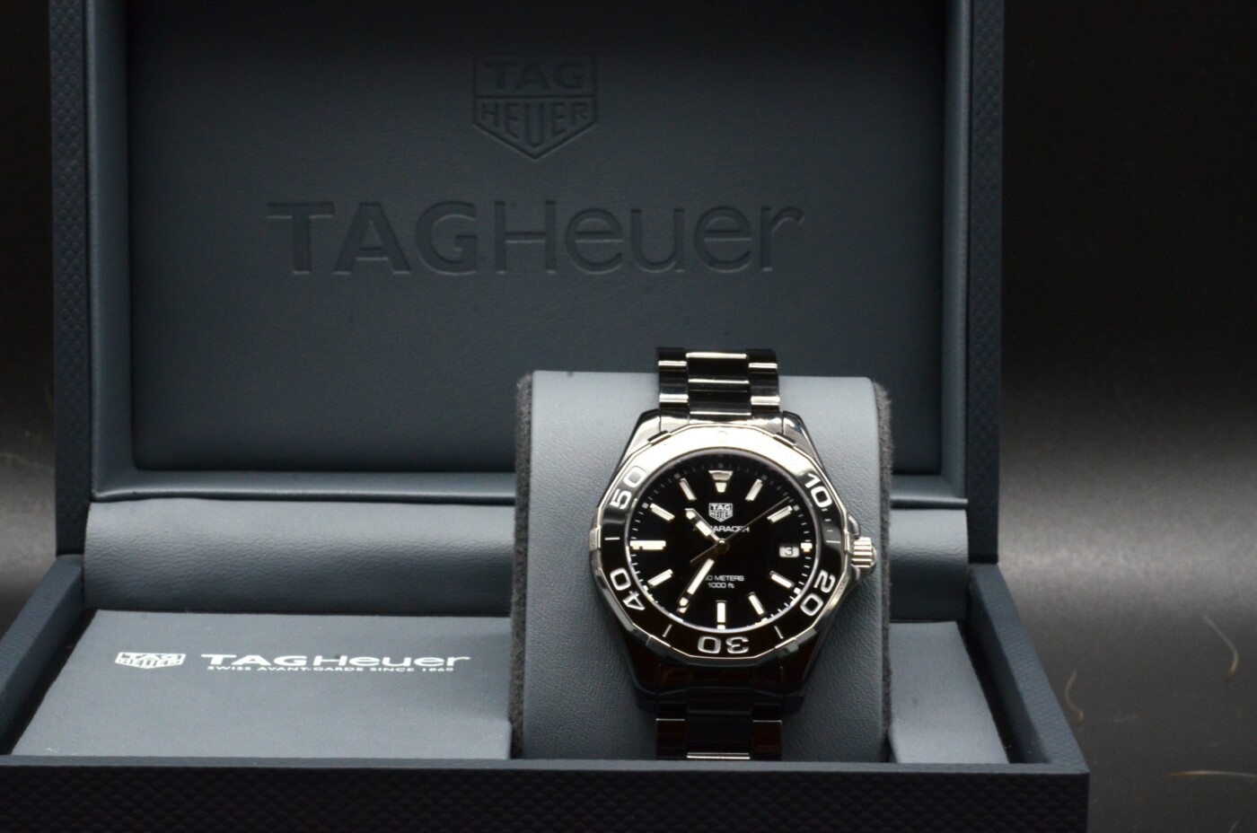Le cadran noir apporte une touche de luxe et de brillance à la montre. Les aiguilles luminescentes et le guichet de date à 3 heures assurent une lisibilité optimale dans toutes les conditions d’éclairage, tandis que le logo Tag Heuer ajoute une touche de prestige à l’ensemble.