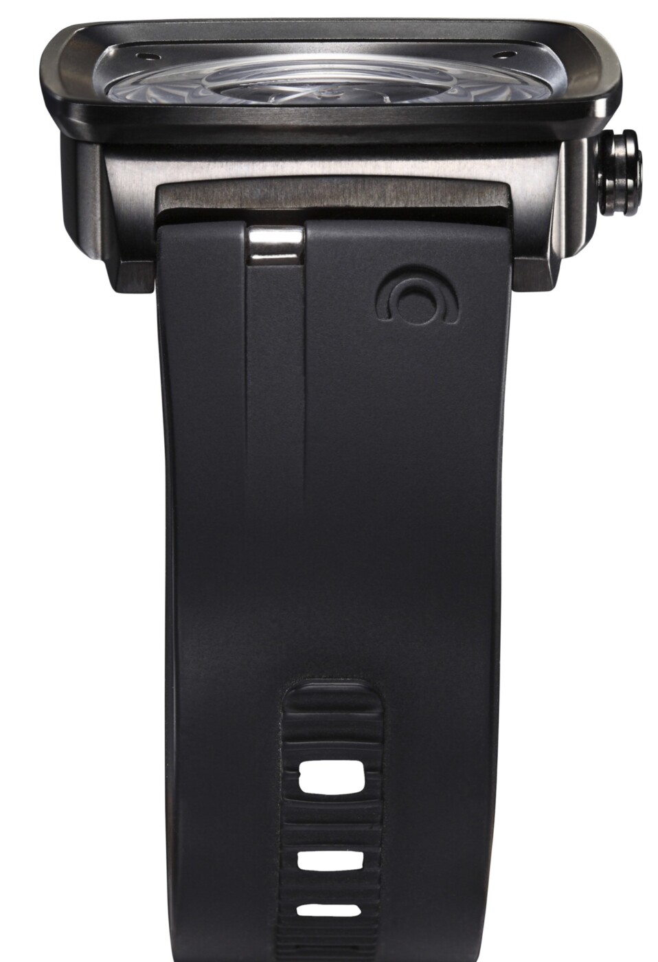 Le cadran, de couleur noire, est de forme carrée arrondie. La particularité est qu’il est incurvé vers le verre qui lui est entouré d’un cercle gris. Un repère temporel est présent mais non exhaustif, pour pouvoir se repérer sur la montre sans perdre l’originalité de la représentation d’une caméra. Les trois aiguilles sont présentes, pour les heures, elle se compose de gris et noir alors que la trotteuse est totalement grise.